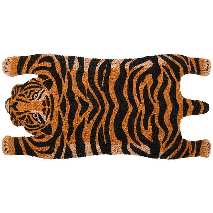 Praktisk dørmåtte Tiger i kokos Dørmåtte i kokos med et sejt tigerdesign. Specielt sjovt til børnefamilier, hvor dørmåtten kan ligge i entreen, når man kommer hjem.Måtten er lavet i natur materiale kokos. Mål: L 74,5 x D 37,5 cm Materiale: Kokosfibre, PVC