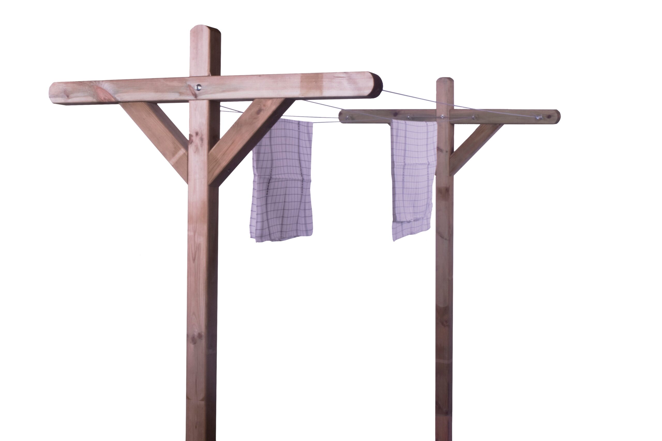 Hortus tørrestativ med 20 meter wire Fremstillet i trykimprægneret 70×70 mm fyrretræ incl. 20 meter plastbelagt wire. Stolperne er 270 cm og derfor beregnet til nedgravning/nedstøbning. inkl. udførlig samlevejledning. 2 stk. stolper 70 x 70 x 2700 mm 2 st