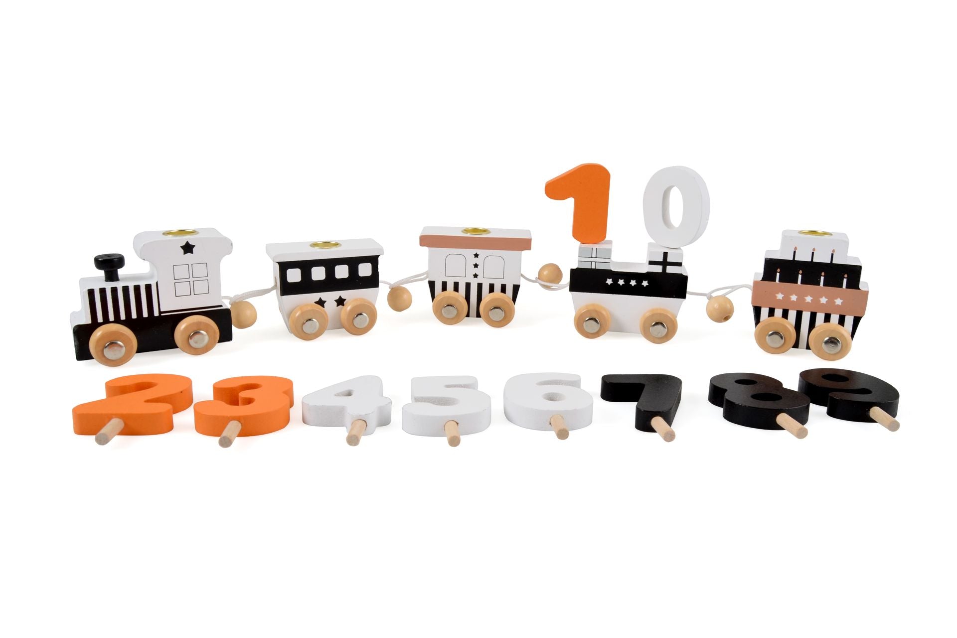 Festlig og multifunktionel fødselsdagstog Toget er fra Magni med lokomotiv og 4 vogne. En perfekt dåbsgave eller gave til etårsfødselsdag. Indeholder tallene 0-9 så man kan sætte fødselsdagsbarnets alder på. Plads til 4 stearinlys. Samlet 40 cm langt. Høj