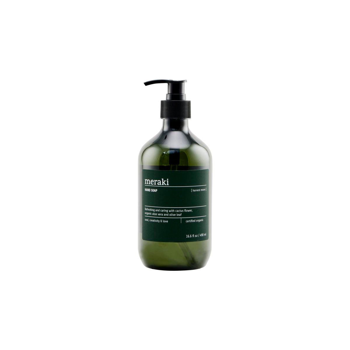 En håndsæbe fra Meraki, som mildt og effektivt rengør og plejer huden Harvest Moon nærer og fugter huden takket være glycerin, aloe vera, olivenolie og ekstrakter fra kaktus. Certificeret økologisk af ECOCERT Cosmos. Note: Rosmarin. Pump en passende mængd